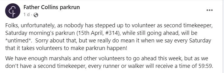 If you’d like to volunteer drop Father Collins an email fathercollins@parkrun.com.